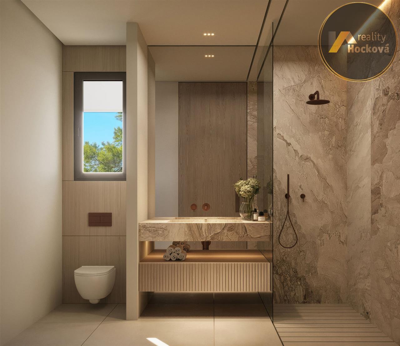 Interiéry jsou zařízeny v moderní paletě neutrálních tónů s kvalitními materiály, které vytvářejí současnou, ale zároveň teplou atmosféru. Ložnice jsou prostorné a vybavené vestavěnými skříněmi, přičemž hlavní ložnice má přímý přístup na terasu. Koupelny jsou dokončeny na vysoké úrovni s jemným osvětlením a čistým, nenápadným designem, vytvářejícím klidnou, spa-like atmosféru ideální pro každodenní život i rekreační pobyty.