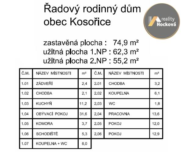 Řadový rodinný dům o dispozici 4+kk (možné i jiné řešení dispozicí dle Vašich požadavků). Obec Kosořice je vzdálená 15km od Mladé Boleslavi. Dům č. 14 je středový s parcelou 258m2. Domy se prodávají ve stadiu holodomu tzn. bez vnitřních stavebních úprav s možností dokončení od developera nebo svépomocí. Přízemí: vstupní chodba, kuchyně, prostorný obývací pokoj se vstupem na zahradu, dále koupelna s WC a technická místnost. 1NP: 3 pokoje, koupelna s vanou, samostatné WC. PENB třídy B. Nabízíme možnost zprostředkování hypotečního úvěru.