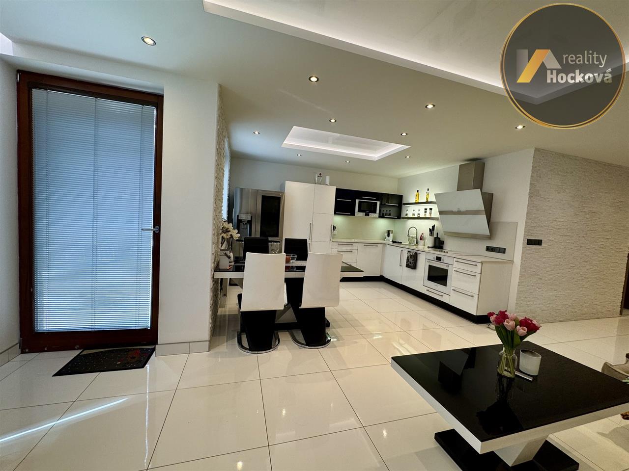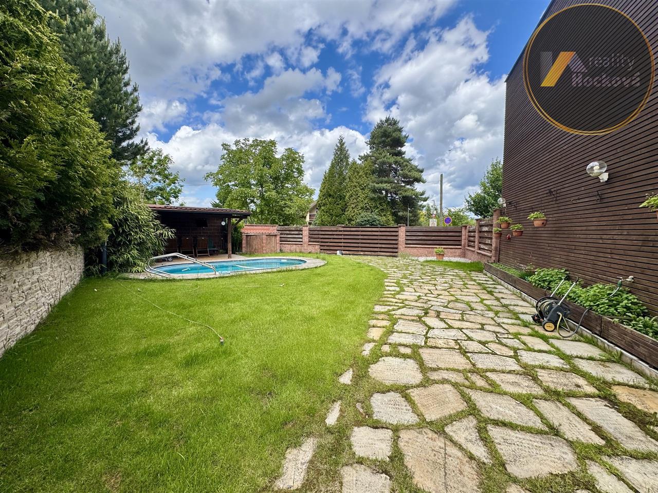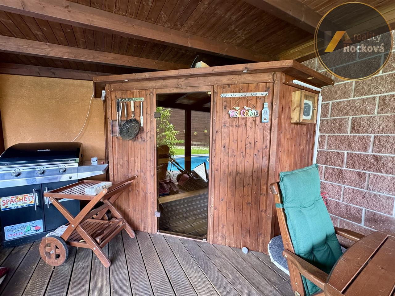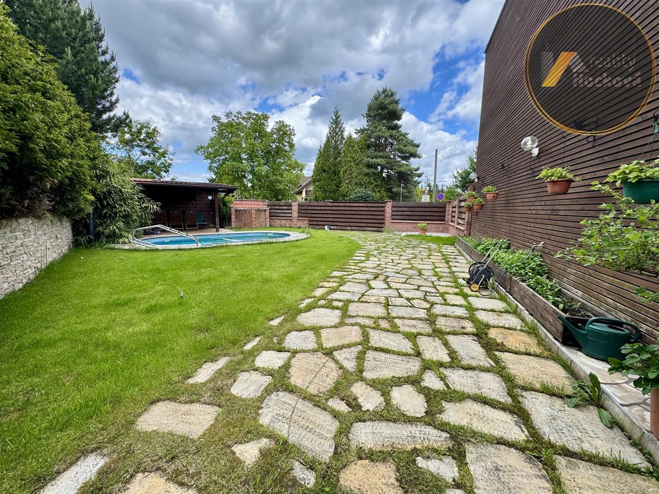 Dominantou přízemí je prostorný obývací pokoj s kuchyňským koutem a jídelnou, odkud je přímý vstup na terasu propojenou se zahradou. Ta vás okouzlí svým bazénem, saunou a krytou pergolou – ideálním místem pro letní posezení nebo večerní odpočinek.