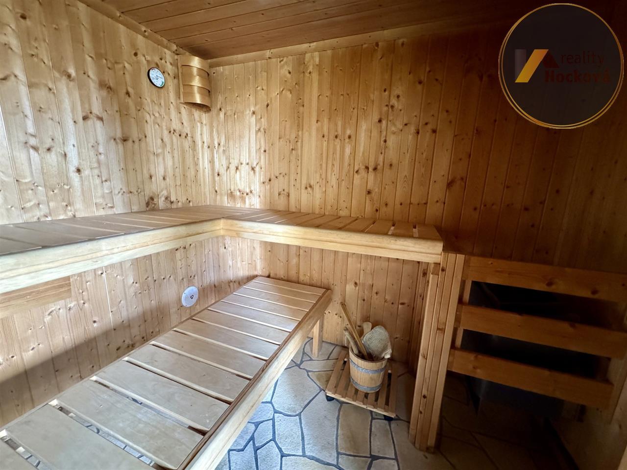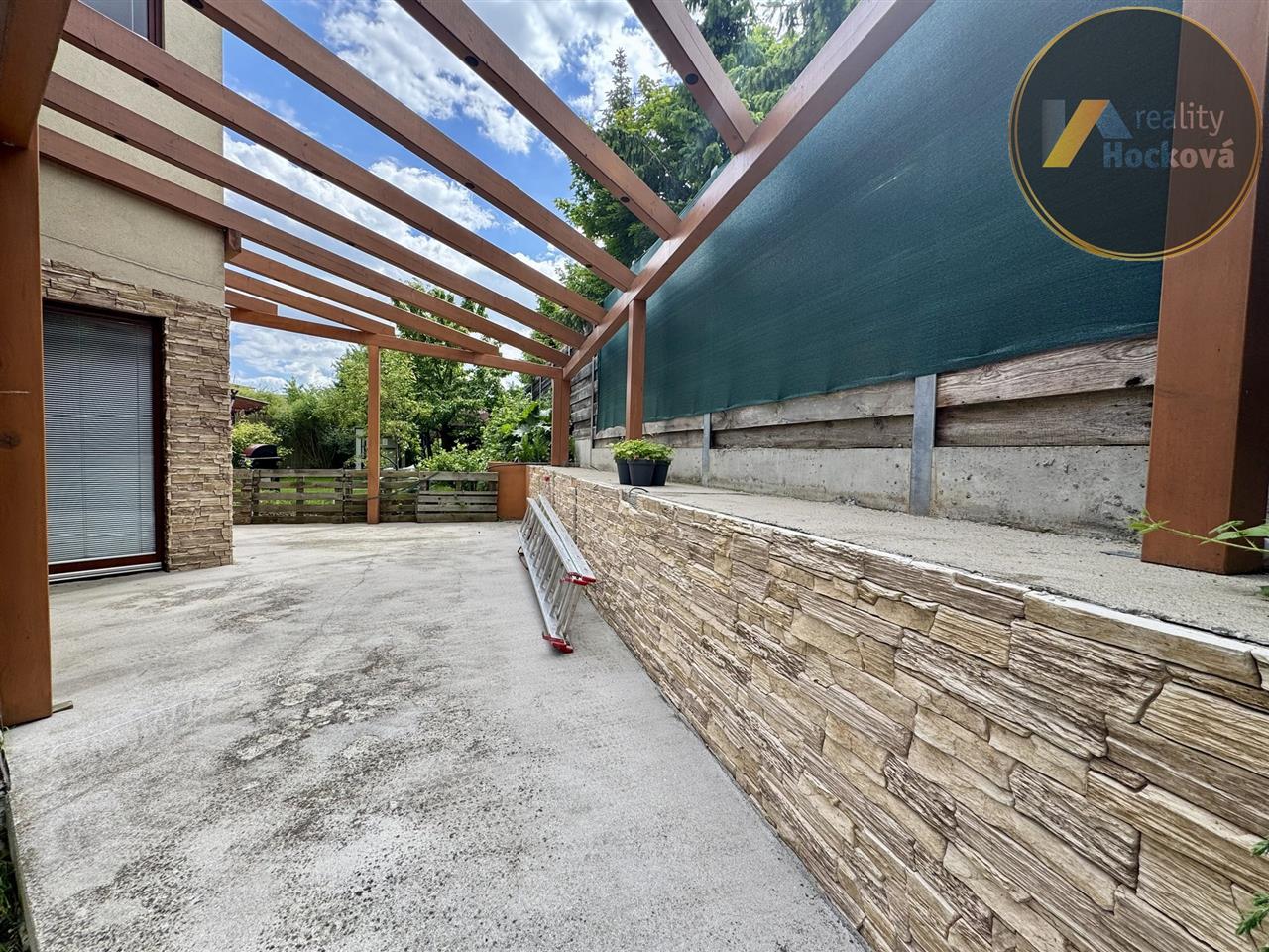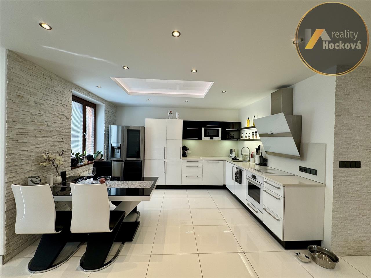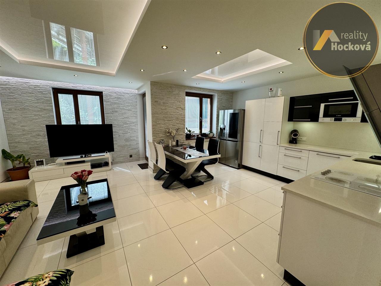 Dominantou přízemí je prostorný obývací pokoj s kuchyňským koutem a jídelnou, odkud je přímý vstup na terasu propojenou se zahradou. Ta vás okouzlí svým bazénem, saunou a krytou pergolou – ideálním místem pro letní posezení nebo večerní odpočinek.