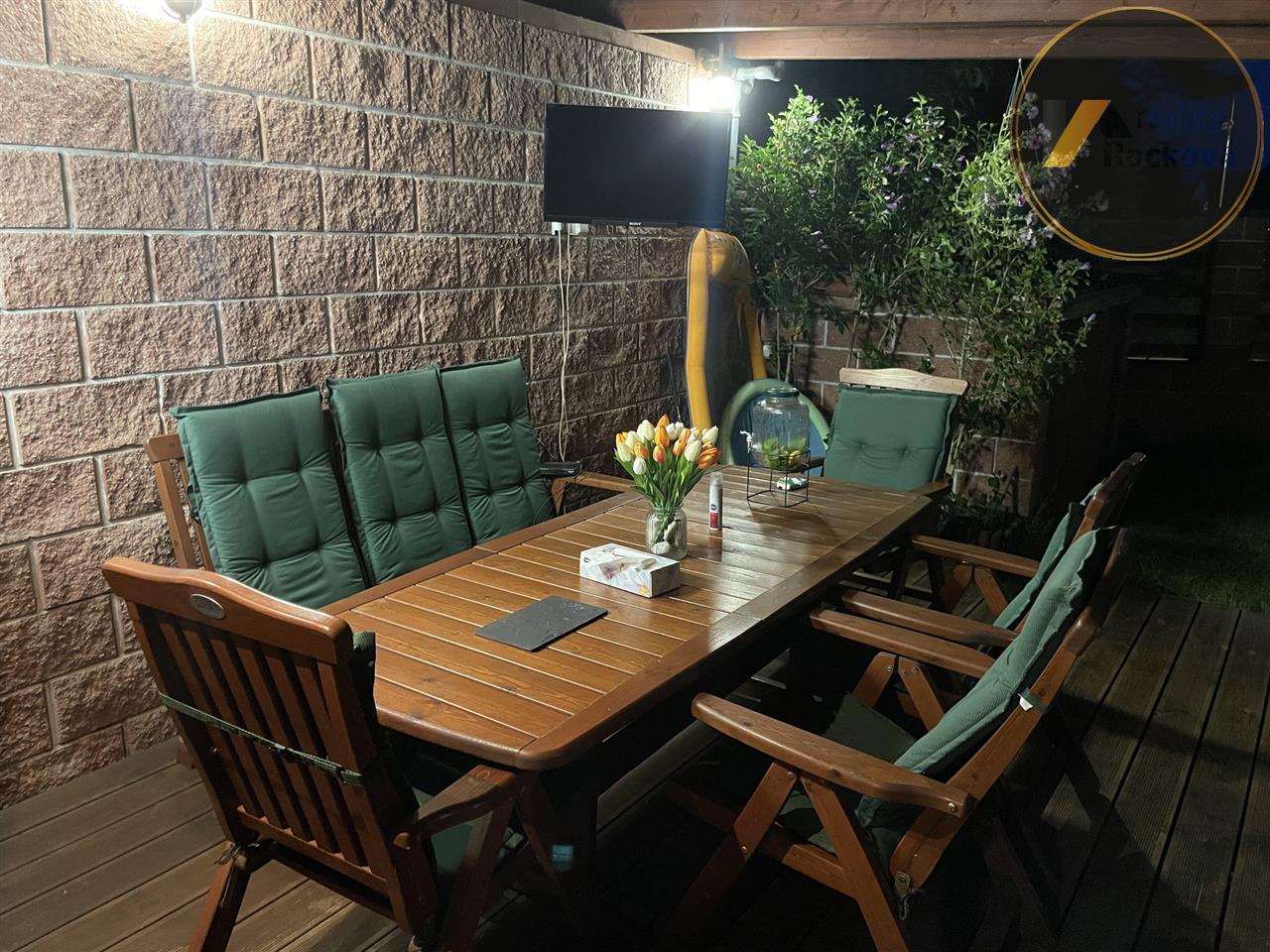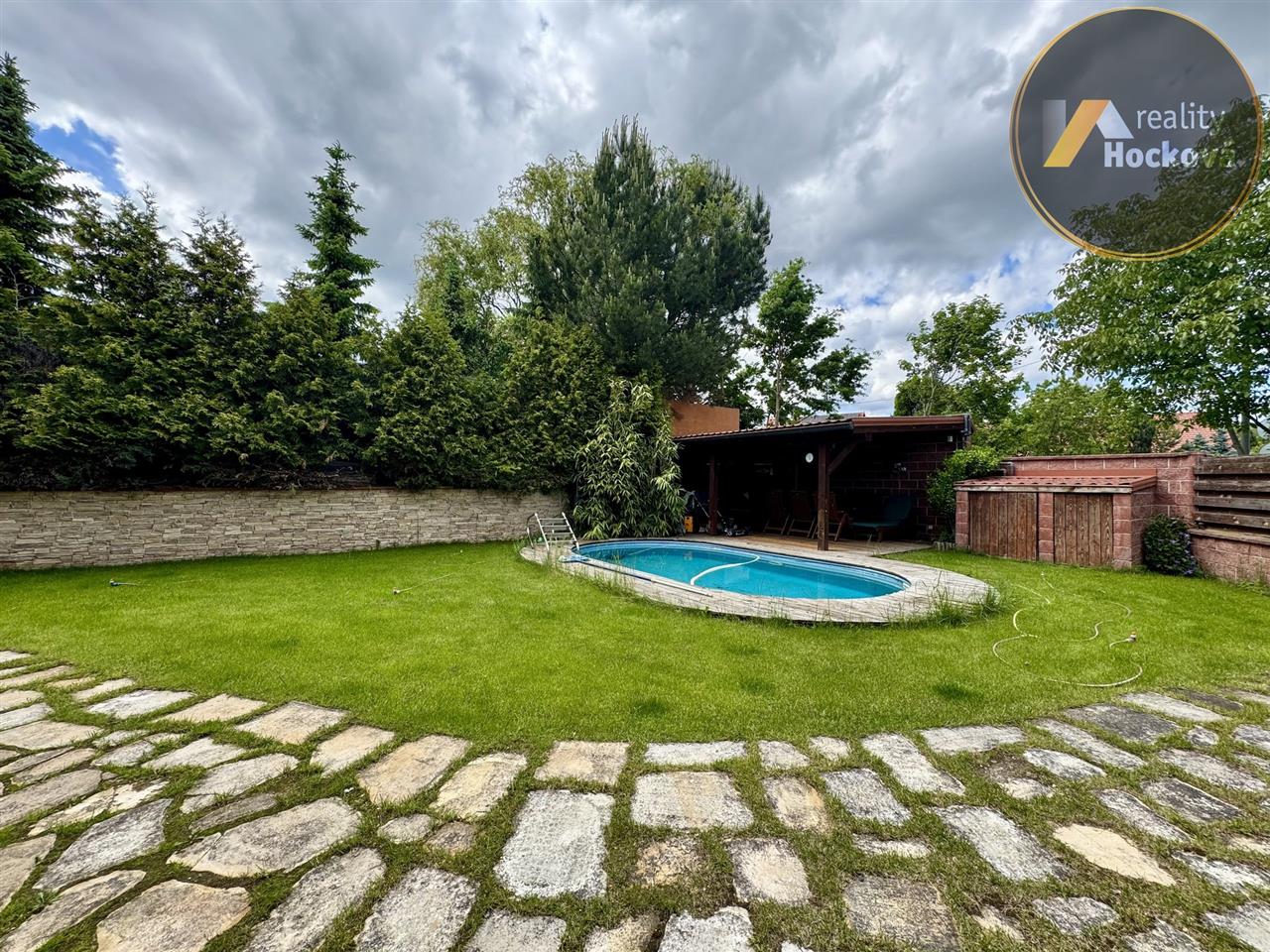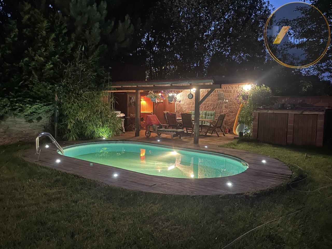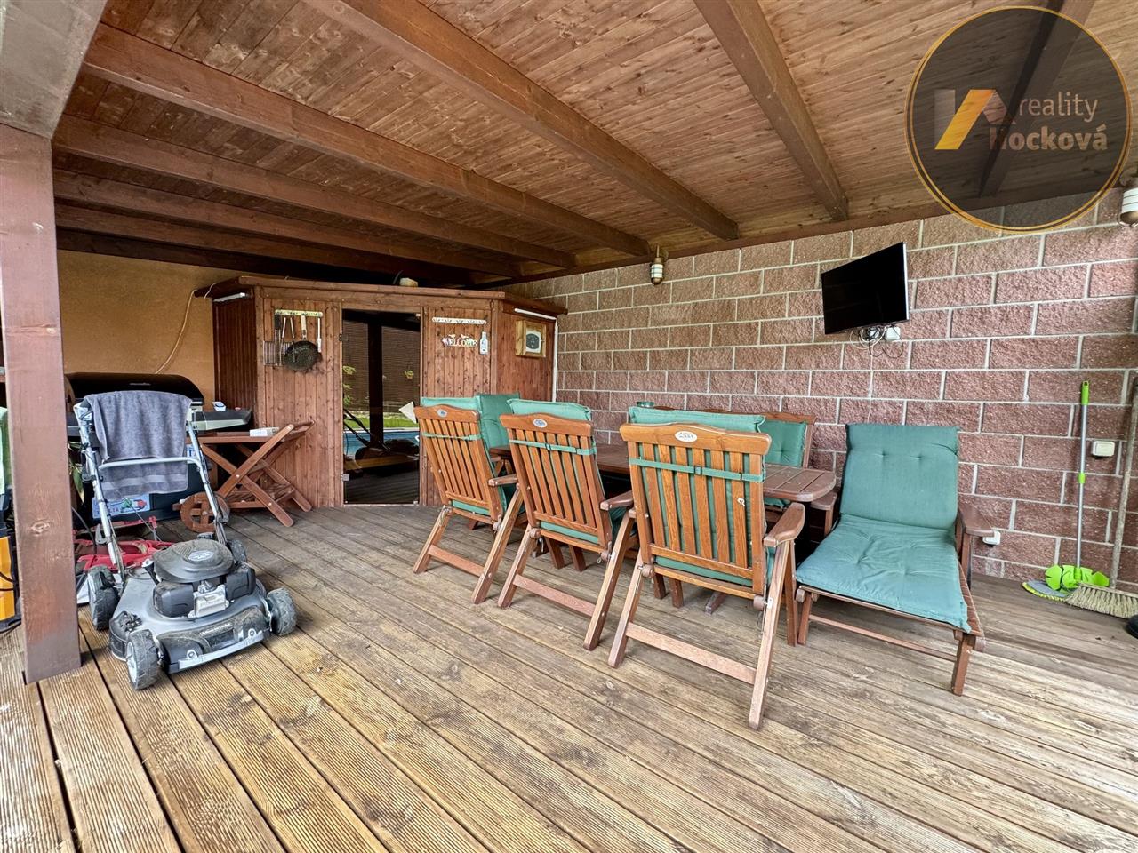 Dominantou přízemí je prostorný obývací pokoj s kuchyňským koutem a jídelnou, odkud je přímý vstup na terasu propojenou se zahradou. Ta vás okouzlí svým bazénem, saunou a krytou pergolou – ideálním místem pro letní posezení nebo večerní odpočinek.