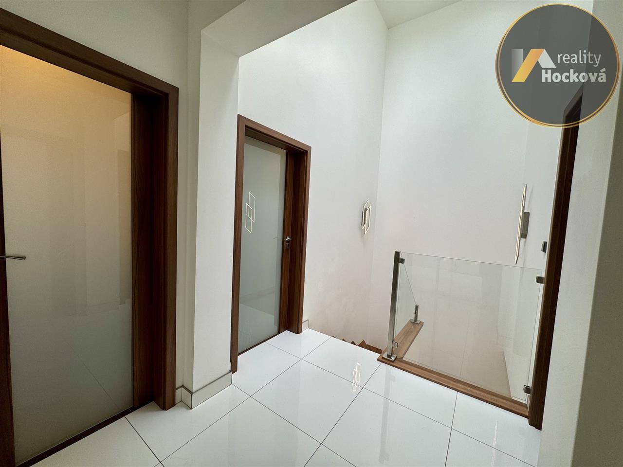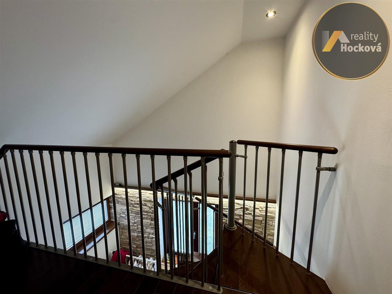 Po schodišti vystoupáte do 1. nadzemního podlaží, kde se nachází: ložnice, koupelna s vanou a dva mezonetové pokoje s vlastními ložnicemi.