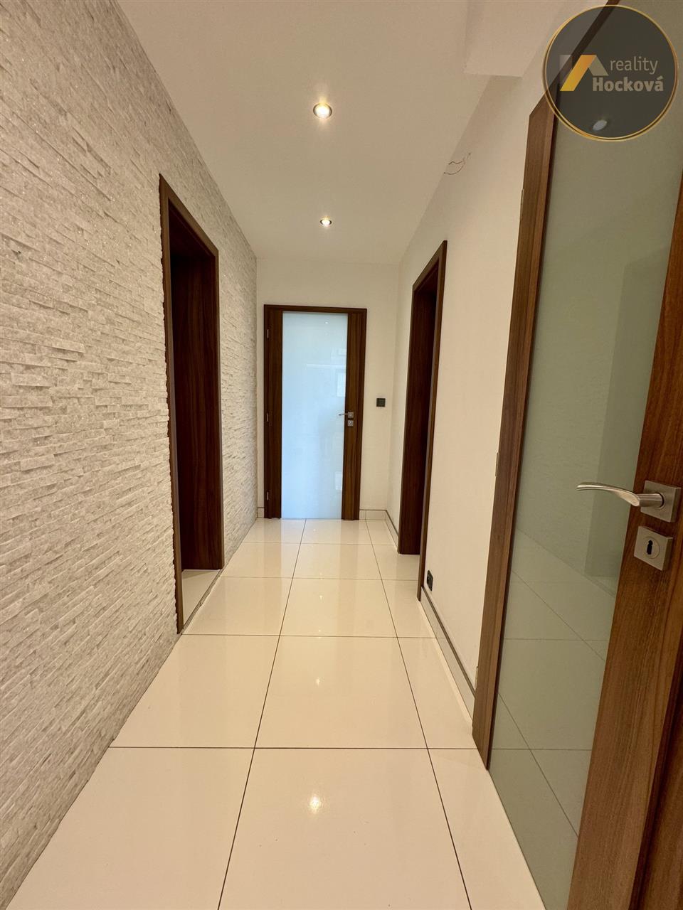 Vstupujete do chodby s vestavěnou skříní, která plynule navazuje na předsíň se vstupy do koupelny s velkým sprchovým koutem a WC, technické místnosti a garáže.